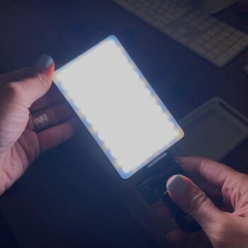 This is the go-to light, and it works wonders. It has scrolling knobs to adjust dimness and warmth. You can clip it onto phones (and with some creativity, many other things). It does require recharging, but it has a sequence of four little lights to display the remaining battery level, and a charging cable is included – it's also compatible with common chargers. A game-changer for professional video and even hobby content creation!