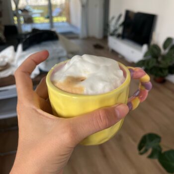 good quality good looking perfect shape fits in hand comes with a spare spinner and ring to control pouring milk and foam