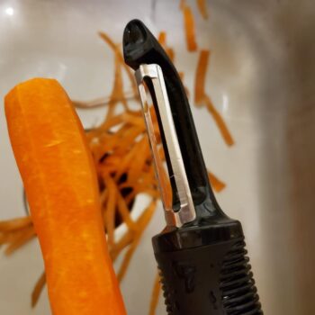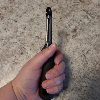 This peeler is fantastic for carrots and other veggies that you peel in long strokes. It works both up and down, which really speeds up the process. The grip is comfortable, but the thick handle doesn't fit in my utensils drawer and it's a bit tricky to fit in the dishwasher.