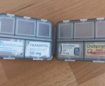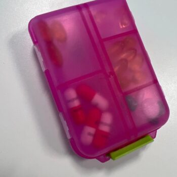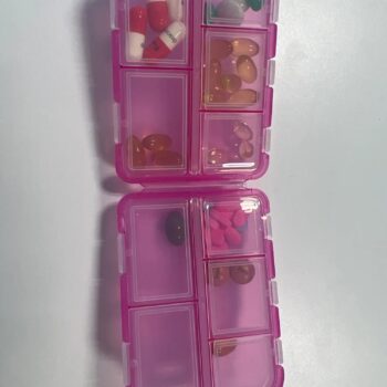 I'm very pleased with this pill organizer. It's the perfect size for holding the medications my partner and I need for a week-long trip. It fits nicely in my travel bag, and the tops of the compartments are large enough for labeling similar-looking pills.